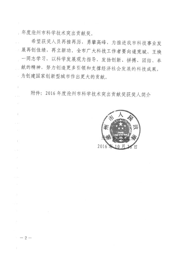 滄州市人民政府授予王煥一先生2016年科學(xué)技術(shù)突出貢獻(xiàn)獎